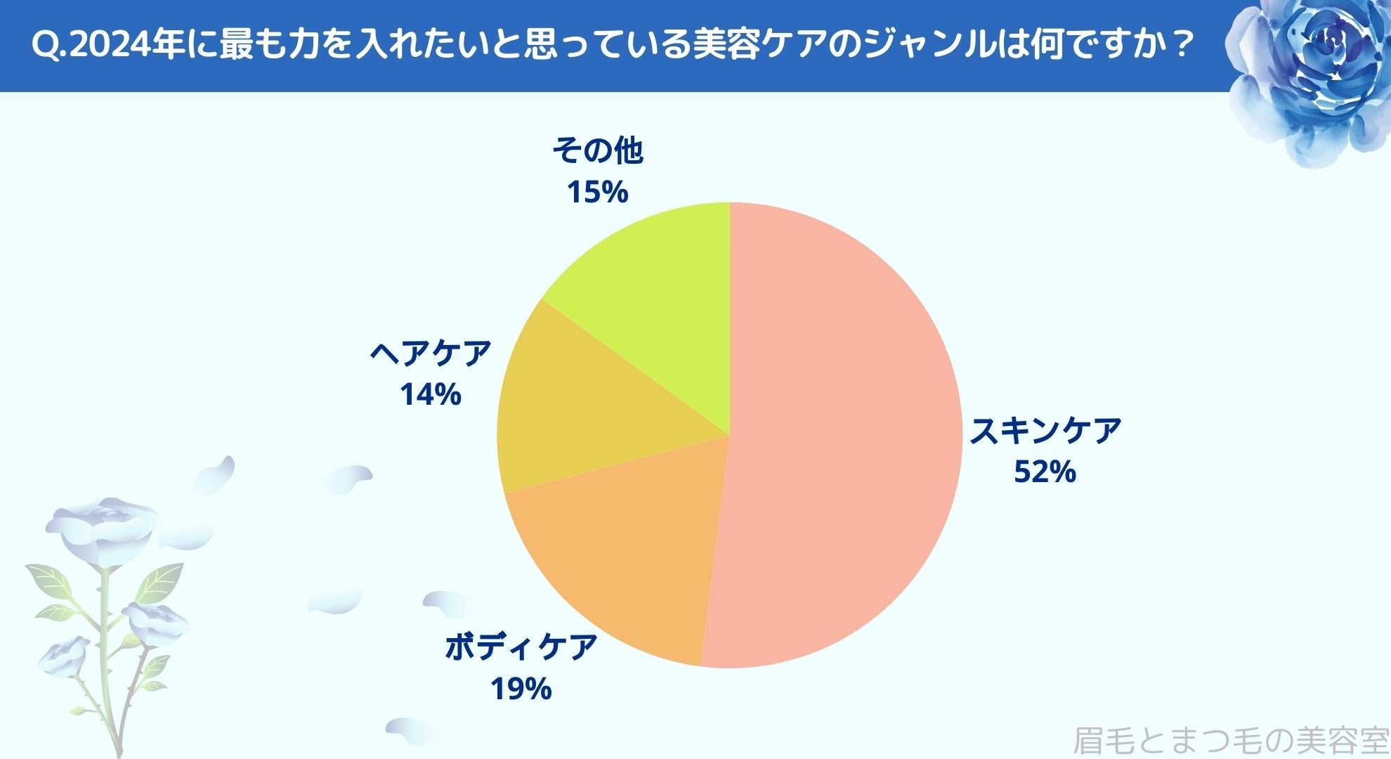 2024年に最も力を入れたい美容ケアをお尋ねしたところ「スキンケア(52%)」、「ボディケア(19%)」、「ヘアケア(14%)」、「その他(15%)」という結果になりました。