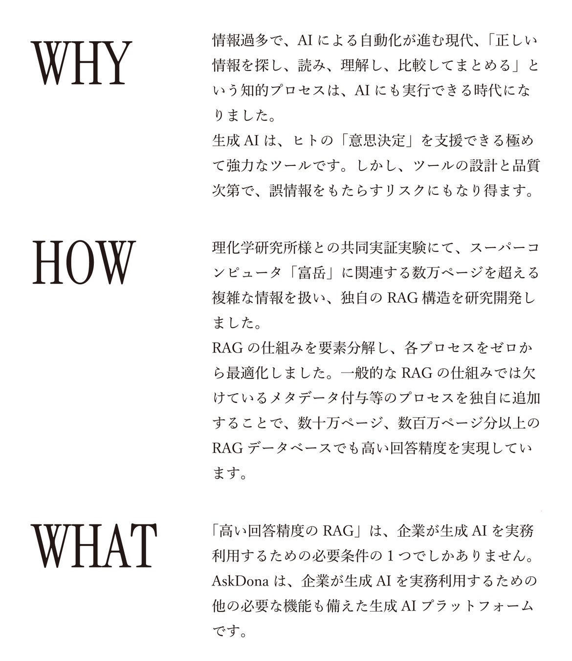 株式会社GFLOPS(本社:東京都渋谷区、代表取締役CEO:盛本マリア、共同代表:鈴木亮祐 以下、当社)は、法人向け生成AIプラットフォーム「AskDona(アスクドナ)」のサービスサイトリニューアルを実施したことをお知らせいたします。新サービスサイトでは、当社が提供するサービスをより適切にお伝えするためのメッセージに加え、今後追加予定の機能紹介も更新頻度高くご紹介させていただきます。