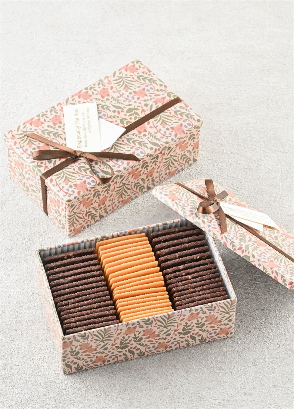 ピンクのニュアンスカラーが可愛い小花柄のクッキー缶に、チョコレート色のリボン。さらに、“Especially for you”のペーパータグが、特別感を演出。自分へのご褒美にもギフトにもぴったりです。
