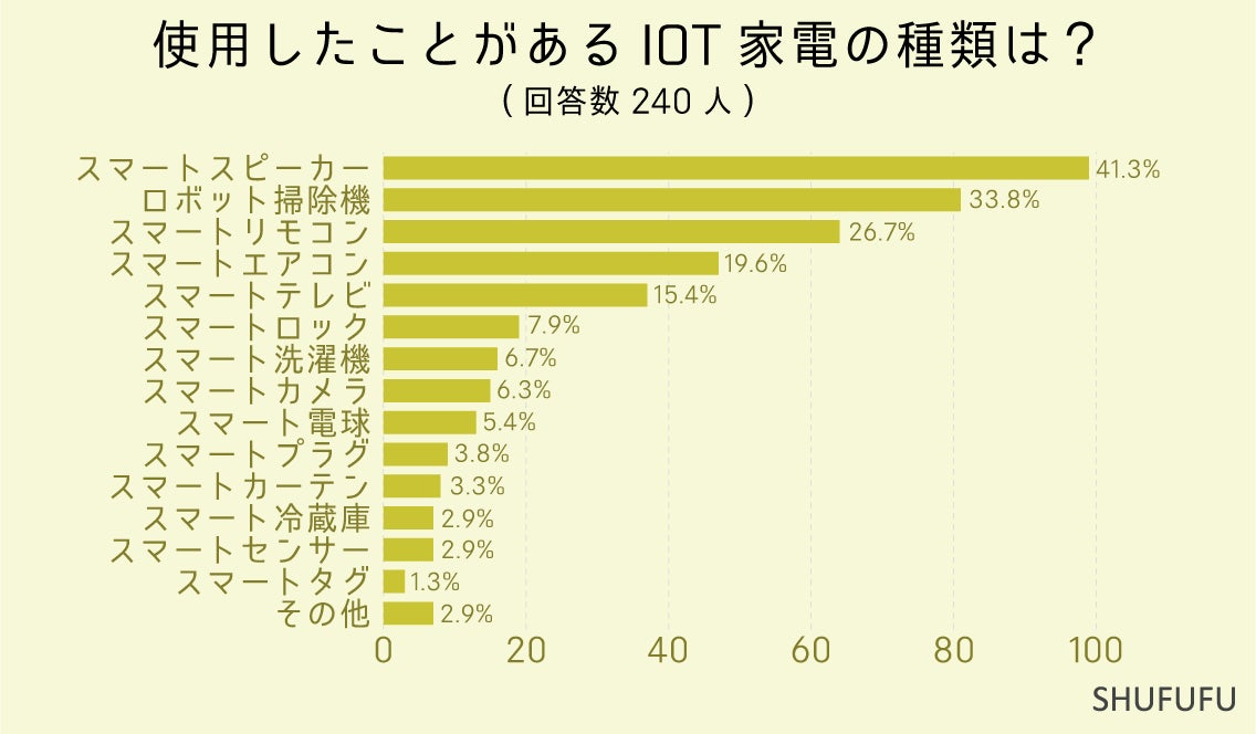 使用したことがあるIOT家電の種類は?の問いに対して最も多かったのが「スマートスピーカー(41.3%)」でした。 次いで「ロボット掃除機(33.8%)」「スマートリモコン(26.7%)」という結果でした。