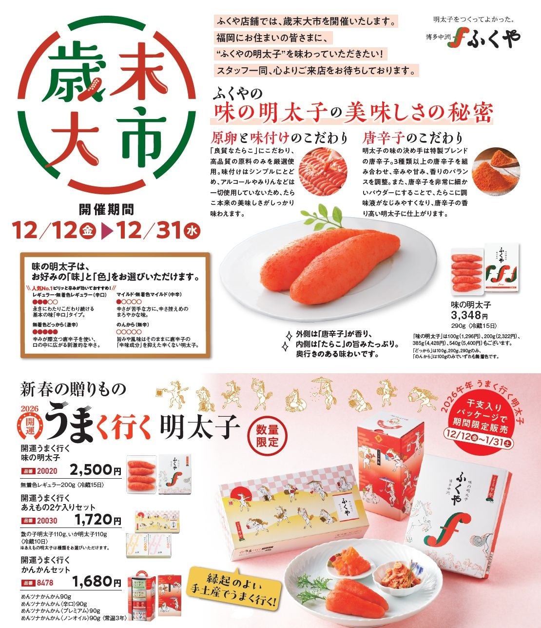 株式会社ふくや(本社:福岡県福岡市、代表取締役社長:川原武浩)は、2025年12月12日より毎年大好評の「歳末大市」を福岡県内の直営店舗(一部店舗を除く)にて開催いたします。
