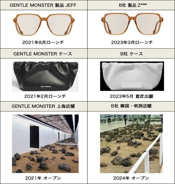 問題が指摘されているB社は、2019年に設立された韓国国内のアイウェアブランドであり、その製品デザインおよび店舗コンセプトがGENTLE MONSTERと類似しているとの指摘が、これまで継続的に寄せられてきた。またオンライン上では、両ブランドが「同じ工場で生産されている」あるいは「姉妹会社」「姉妹ブランド」であるといった、出所が確認されていない情報が拡散された経緯もある。