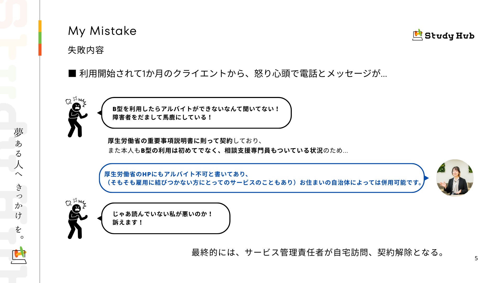 Study Hub 支援員 木内 理沙は、「本当に欲しているものはなにか? ~情報は正しいだけでは価値がない~」をテーマに、実際の支援現場での失敗事例、その後の支援への改善策を発表しました。