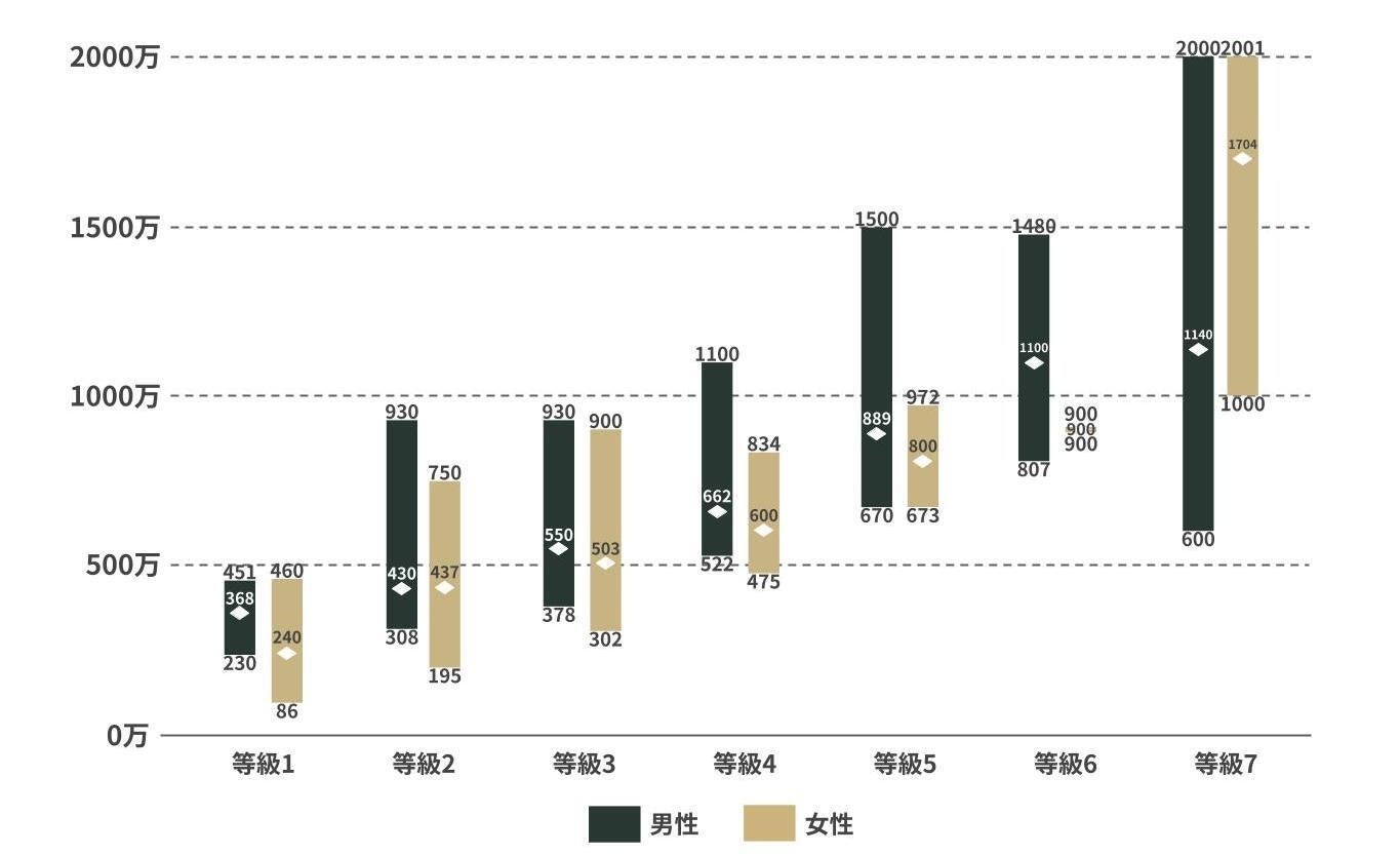 1年間あたりの報酬データについて、等級別の報酬額の中央値を男女ごとに比較しました。