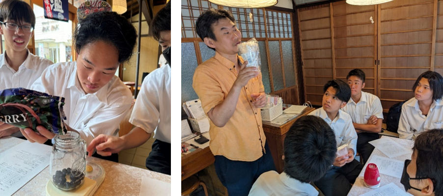商品開発に試行錯誤する、北村みそ本家の北村社長と常翔啓光学園の高校生