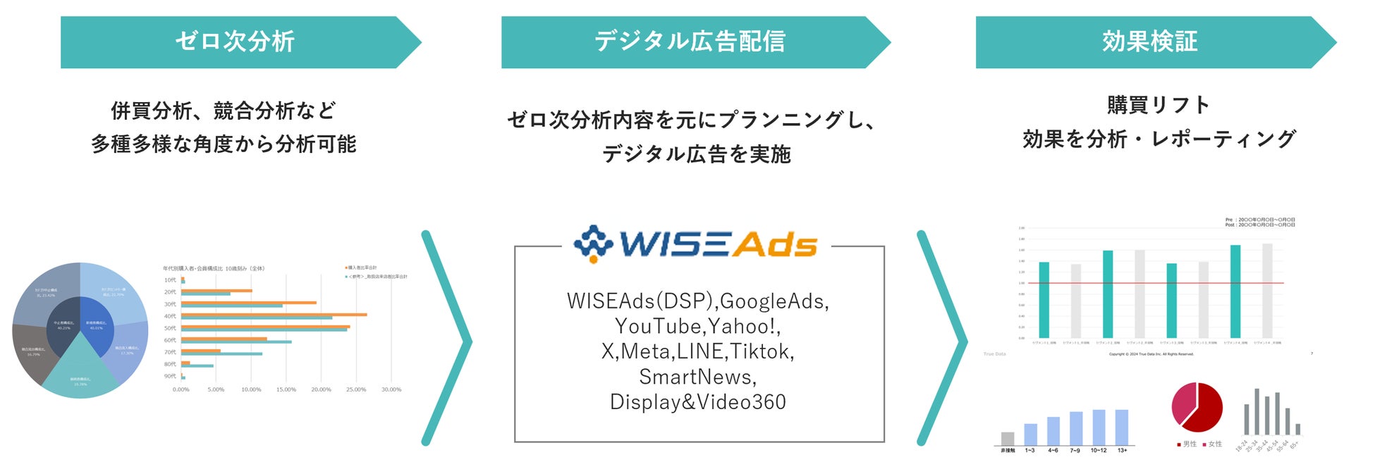 株式会社Hakuhodo DY ONE(所在地:東京都港区、代表取締役会長:田中雄三 代表取締役社長:小坂洋人、以下 Hakuhodo DY ONE)と株式会社True Data(トゥルーデータ、本社:東京都港区、代表取締役社長:米倉裕之、以下True Data)は、True Dataの購買データを用いて、ゼロ次分析から広告配信、事後の購買分析までを一気通貫で実施できる新サービス「WISE Ads BrandBooster(通称:WISEAds BB)」の提供を開始いたします。