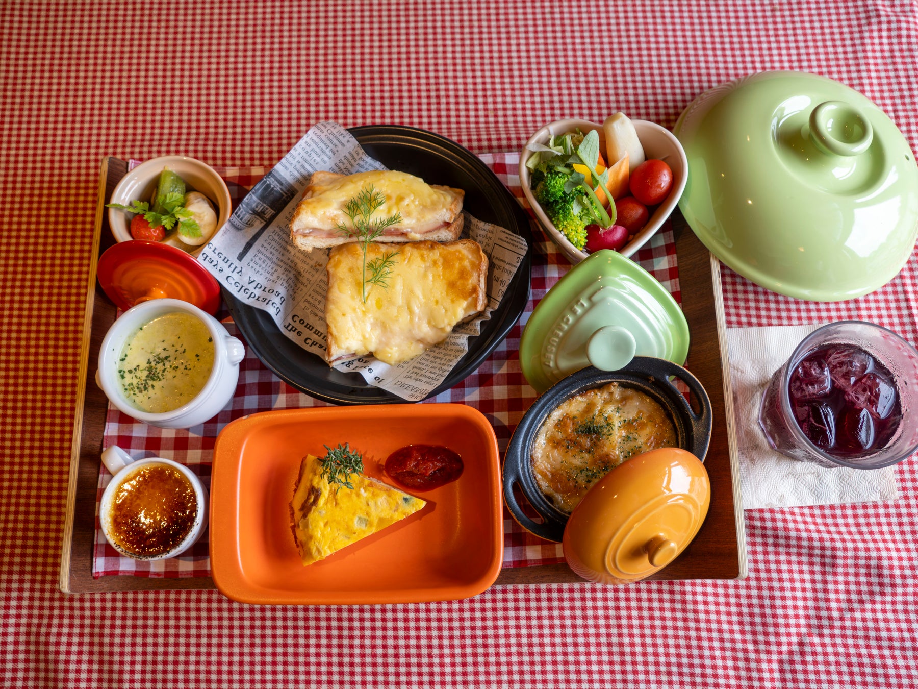 ■スペイン風オムレツ■ポタージュ サンジェルマン■クロックムッシュ■ニース風サラダ■ジャガイモのグラタン■クレームブリュレ■フルーツ■ブドウジュース