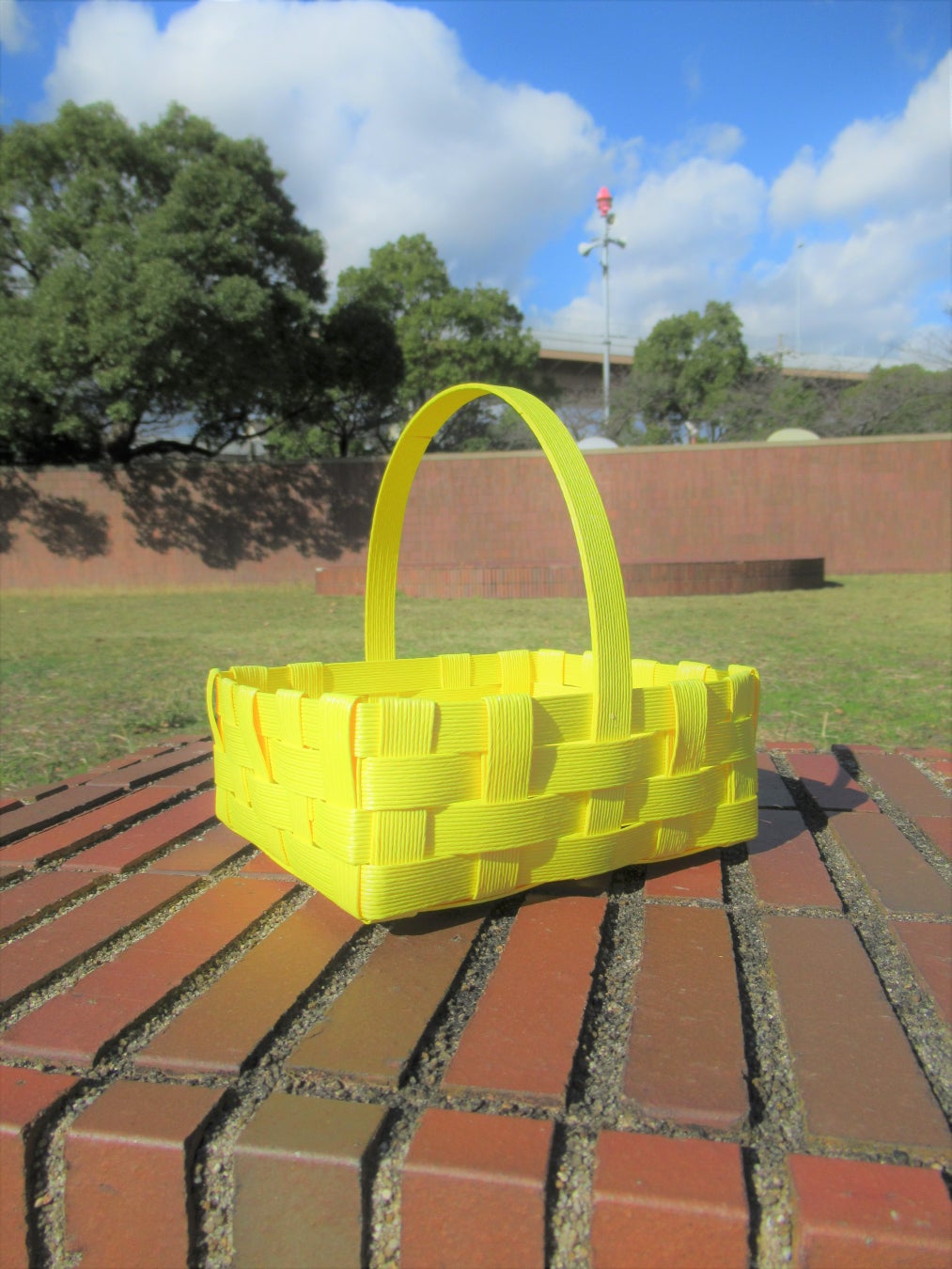 人形やお菓子を入れるのにぴったりなサイズのカゴをクラフトバンドで編みます。取っ手つきなのでちょっとしたお出かけにもぴったり。