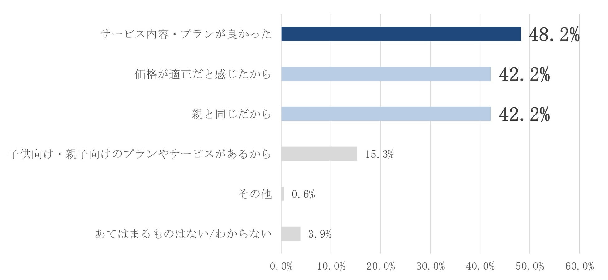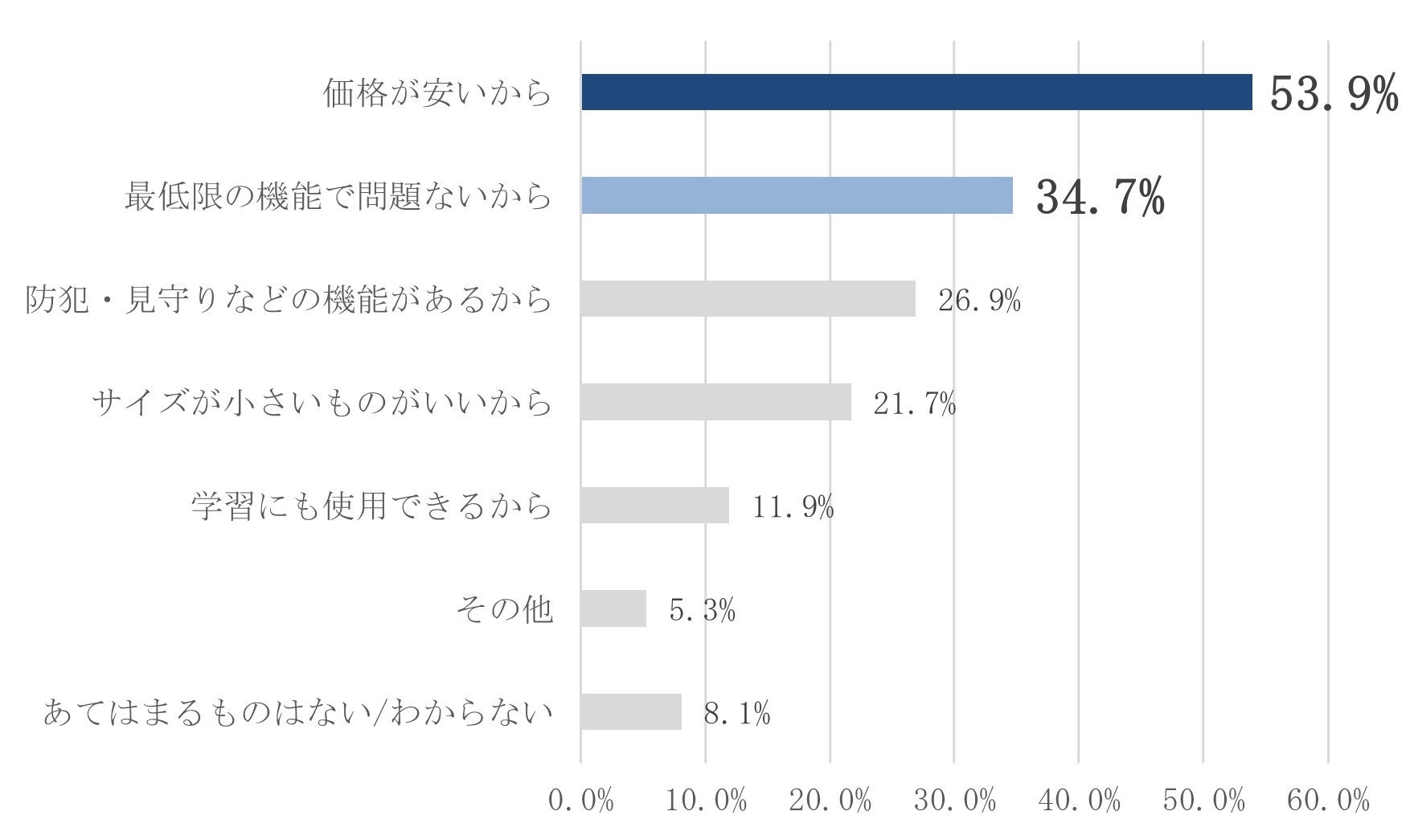 現在の端末を選んだ理由としては、「価格が安いから(53.9%)」「最低限の機能で問題ないから(34.7%)」が多く、キャリアを選んだ理由は「サービス内容・プランが良かった(48.2%)」「価格が適正だと感じたから(42.2%)」「親と同じだから(42.2%)」となっており、端末もキャリアも選ぶ基準としては価格とサービスの質や使いやすさのバランスが重視されていることが読み取れます。