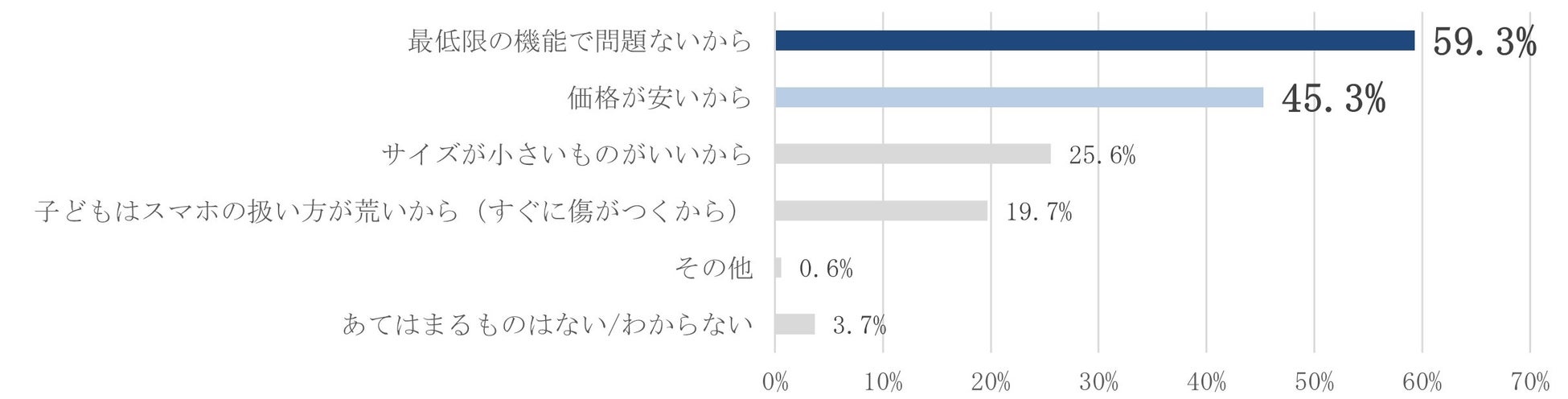 子どものスマホ料金に対する“コスパ”意識が増す中、子どもに中古スマホを使用させたことがある親は63.7%に上りました。中古スマホを購入・選択した理由は「最低限の機能で問題ないから(59.3%)」「価格が安いから(45.3%)」が多く、子どものスマホ料金をより抑えるために、シンプルな機能性で価格の安い中古スマホが注目されていることが読み取れます。