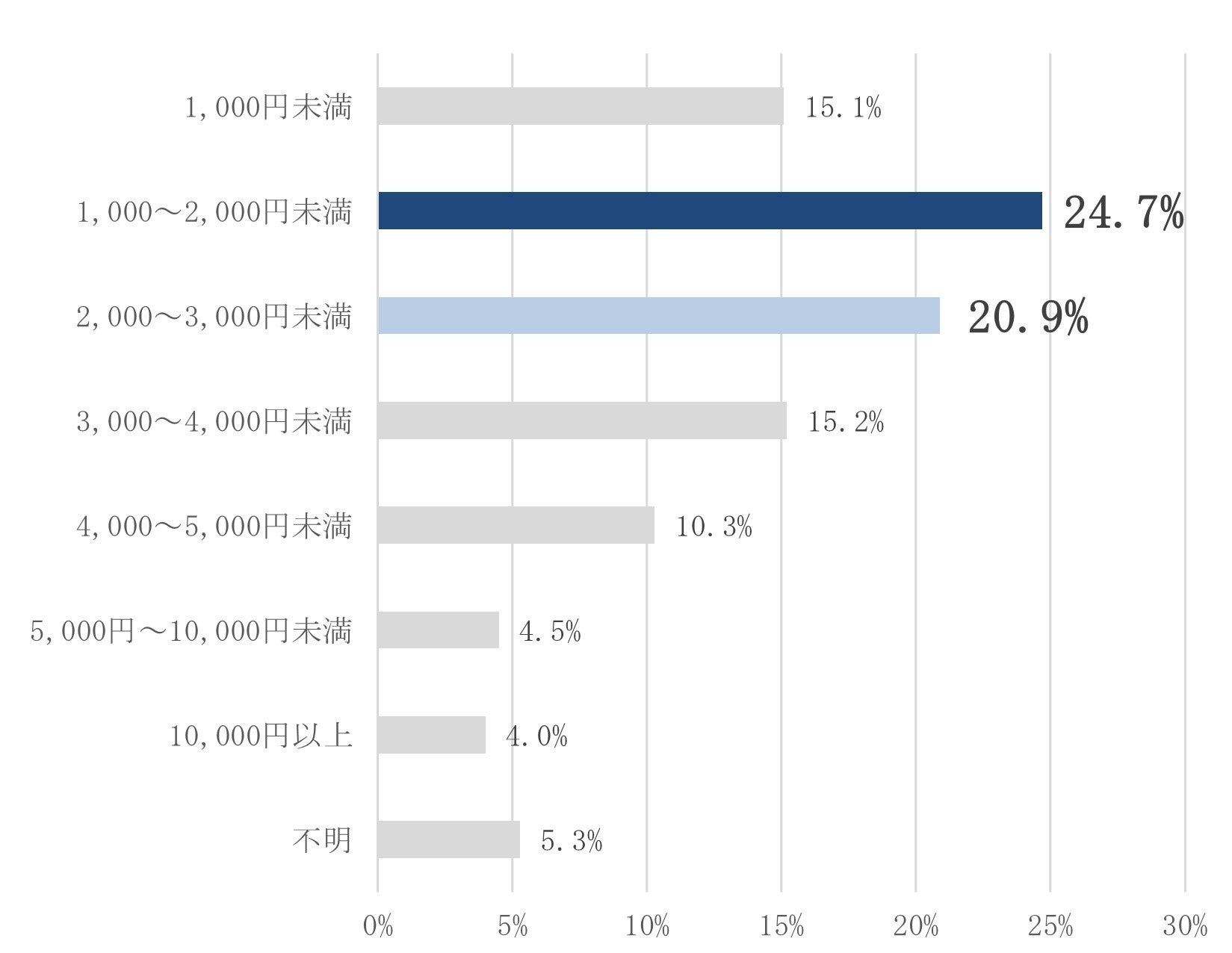 小学1~6年生の子どものスマホの平均月額料金は「1,000~2,000円未満(24.7%)」が最も多く、次いで「2,000~3,000円未満(20.9%)」でした。「1,000円未満」も15.1%と半数以上が3,000円未満の低料金でスマホを利用していることが明らかになりました。