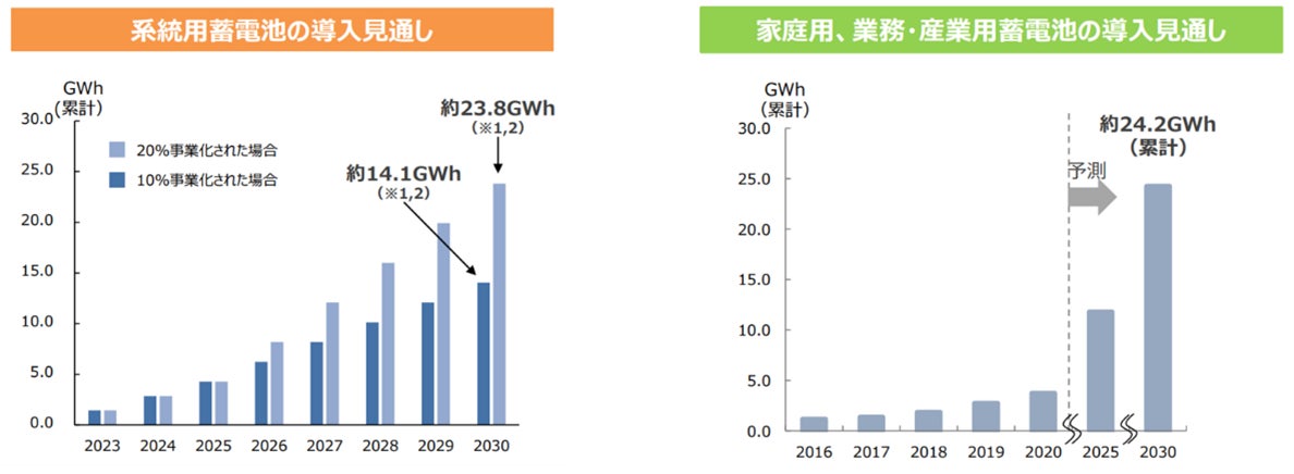 また、内閣官房が2023年11月に公表した蓄電池の導入見通しにおいて、系統用蓄電池の導入量は、2030年に累計約14.1~23.8GWh、家庭用、業務・産業用蓄電池の導入量は、2030年に累計約24.2GWhとなる見通しであり、今後、蓄電池システムの更なる拡大が見込まれています。