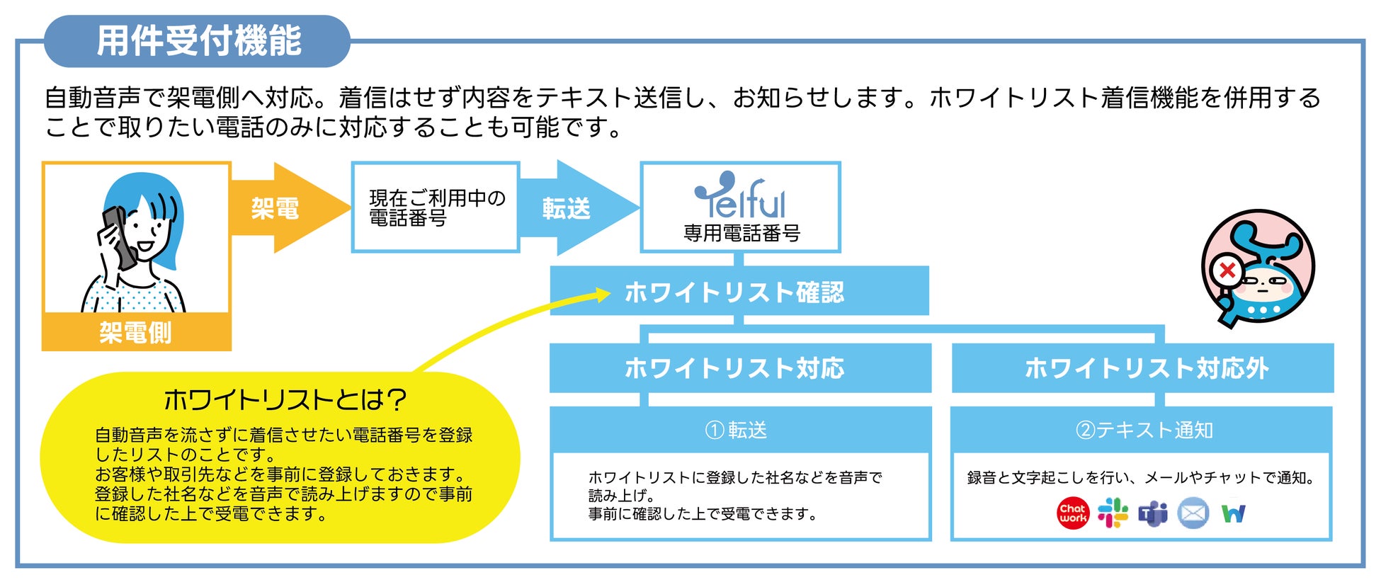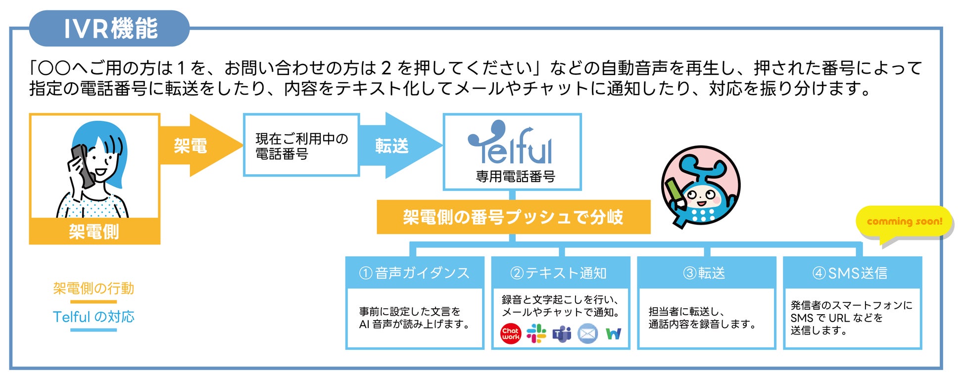 Telfulは、ボタン操作や営業時間、電話番号で電話対応を振り分けて、電話応対品質を下げることなく電話業務の負担を減らし、業務効率化を実現する電話システムです。