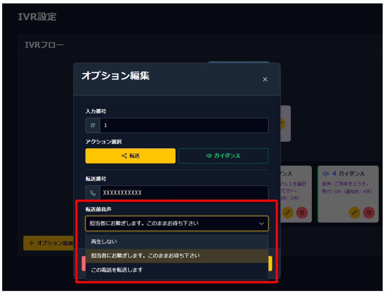 IVR(自動音声応答)で転送を行う際に、メッセージを流してから転送することが可能になりました。2種類のメッセージ、及び音声なしからお選びいただけます。