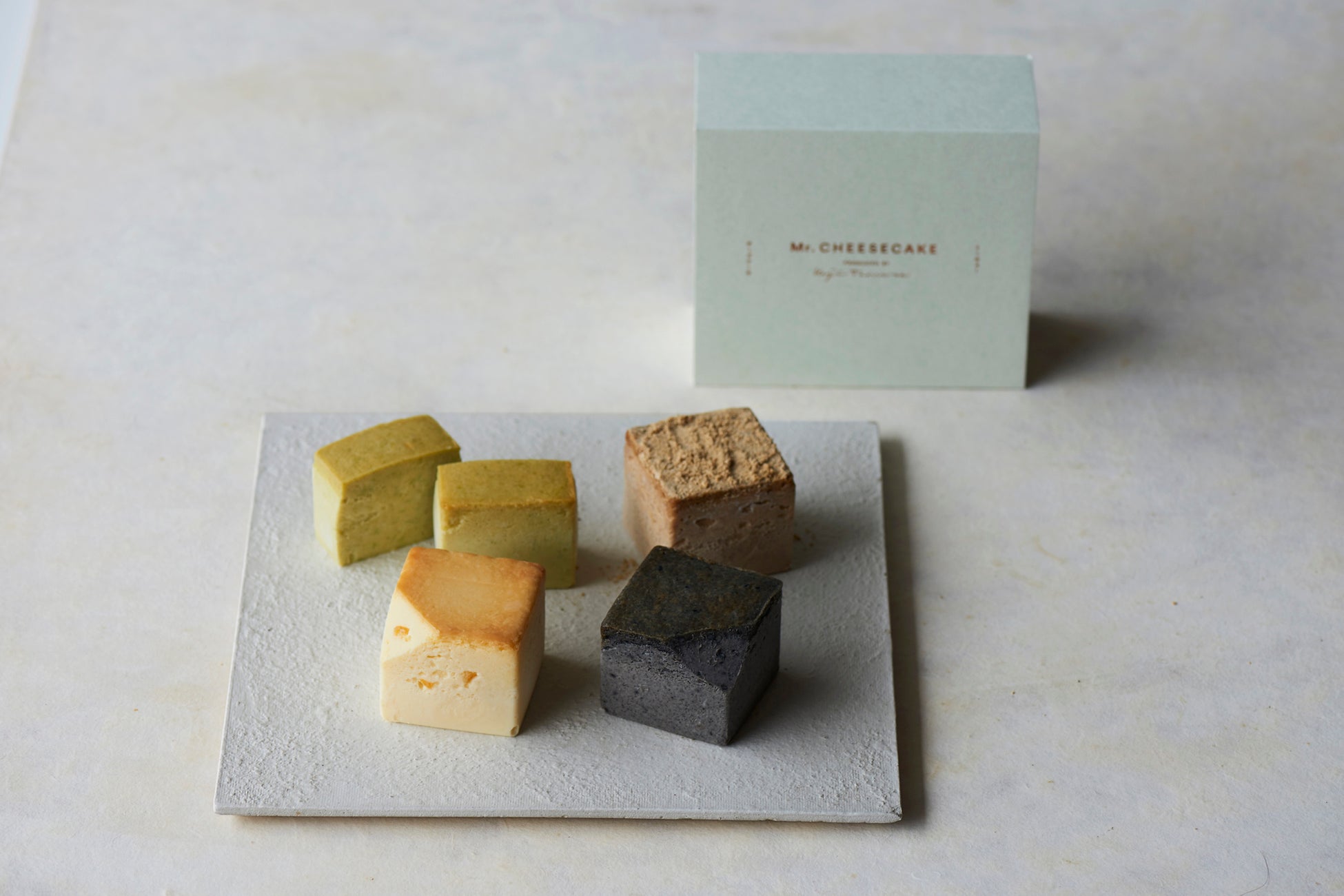 日本で親しまれてきた素材を使用した、和のアソートセット。柚子の芳醇な香りと心地よい酸味を楽しめる「柚子オリーブ」、濃厚で香ばしい味わいを生かした「黒胡麻バニラ」、北海道産の枝豆にジャスミンライスを合わせた濃厚な味わいの「ずんだジャスミン」、メープルシロップの旨味ときなこの香ばしい味わいを楽しめる「きなこメープル」のキューブ型チーズケーキをオリジナルのボックスに詰めました。