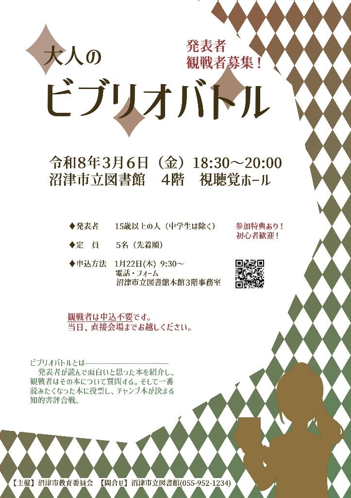 【沼津市立図書館】「大人のビブリオバトル」 発表者・観戦者募集!