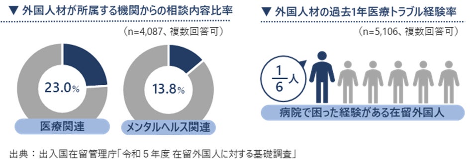 日本で暮らす外国人にとって、医療機関の受診は依然として高いハードルとなっています。出入国在留管理庁の調査※3によると、外国人材が所属する機関に寄せられる相談のうち、23.0%が医療に関する内容、13.8%がメンタルヘルスに関する相談となっています。