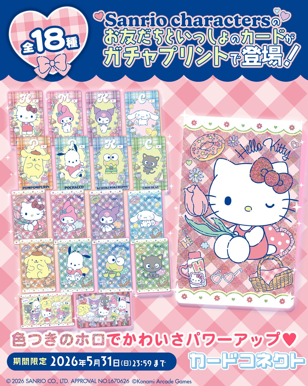 株式会社コナミアーケードゲームスは、アミューズメント施設向けカードプリントゲーム機『カードコネクト』にて、株式会社サンリオのキャラクターたちとコラボレーションしたデザインイベントを5月31日(日)まで開催していることをお知らせします。