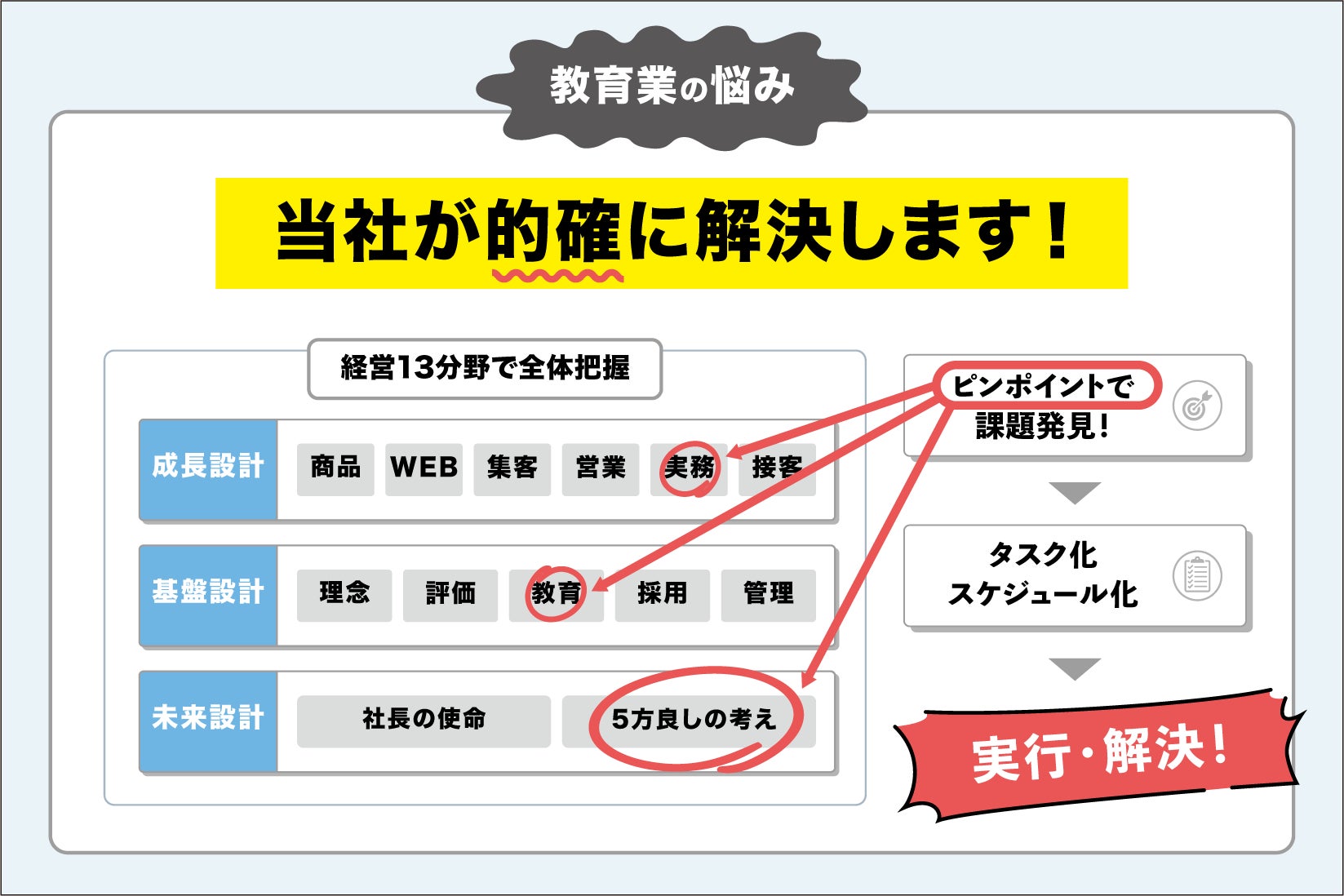 単なる売上拡大ではなく、売上・利益・教育品質・組織運営を同時に整える経営設計を支援します。