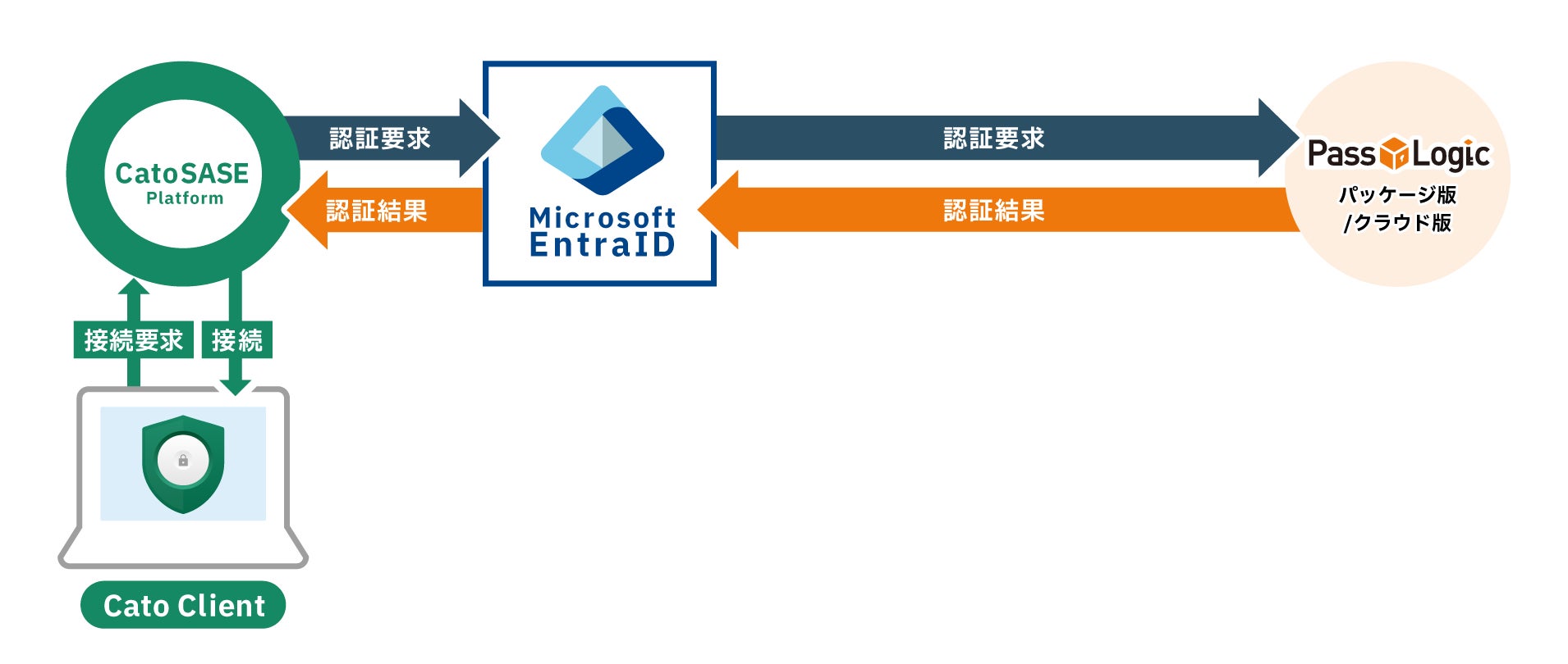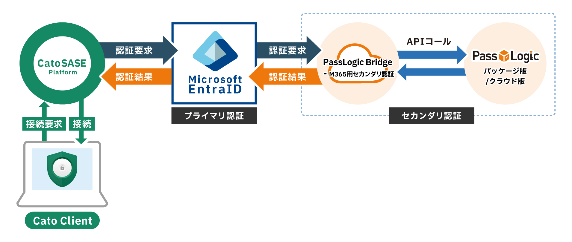 PassLogicは、Entra IDの外部MFAに対応しています。PassLogicの「PassLogic Bridge – Microsoft 365用セカンダリ認証」機能を用いることで、Entra IDのセカンダリ認証としてPassLogicを組み込み、Entra IDと連携しているCato SASE Platformへのアクセス時に多要素認証を適用することが可能となります。