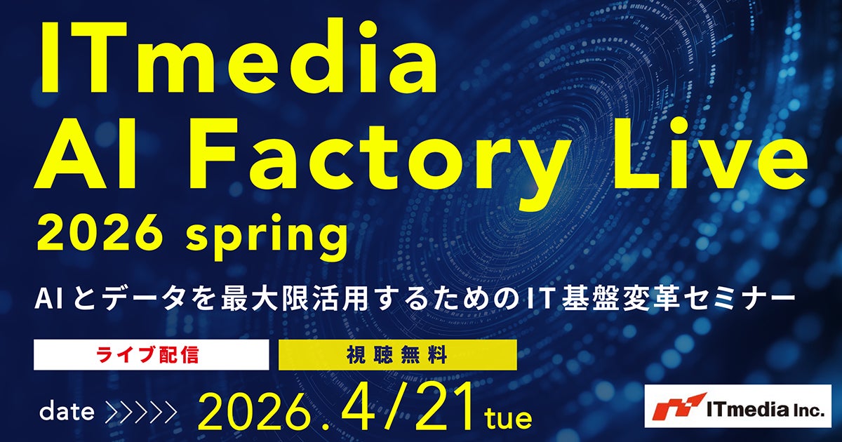 アイティメディア株式会社(本社:東京都千代田区、代表取締役社長 兼 CEO:小林教至、以下アイティメディア)は、2026年4月21日(火)にオンラインセミナー「ITmedia AI Factory Live 2026 春」を開催します。AIがビジネスのエンジンとなる今、鍵を握るのは「自社に最適化された独自のAI」と「AIを育てるデータ基盤」の統合です。本セミナーでは、ライオンやNVIDIAといった先駆的な企業の事例を通じて、企業が独自のAI環境を構築してビジネス価値を創出するための実践的なロードマップを提示します。