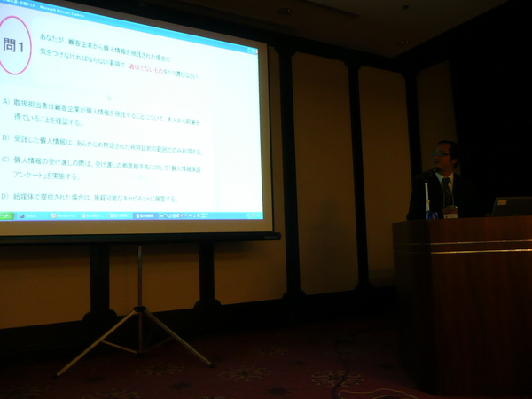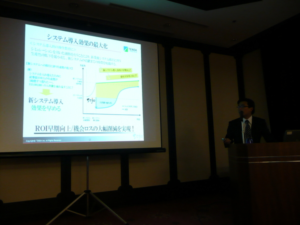 テンダ講演では、「金融機関における教育環境の構築と強化~城北信用金庫様導入事例のご紹介」と題して、IT投資に対して重要となる人材教育について、金融機関における4つの問題点である、(1)サービス企画のスピードに現場の教育が追い付かない、(2)専用端末など特殊機器が多くマニュアル化が難しい、(3)教育機会が少なく浸透に時間がかかる、(4)集合研修と紙の資料だけでは教育効果が低い という点に着目し、これらを解決することにより、IT投資の効果を最大限に発揮し、短期間で効果的な人材教育を実現出来るソリューション、Dojo(道場)( http://www.tepss.com/dojo/ )をご紹介しました。