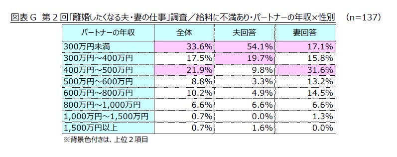 夫・妻別でみた場合、過半数の夫が不満を抱く妻の年収は「300万円未満」(同54.1%)であり、「300万円以上400万円未満」(同19.7%)と合わせると7割超となります。一方、夫の給料に不満を持つ妻のおよそ3分の1は、夫の年収が500万円以上であり、妻の方がパートナーに対して高い給料を求めていることが明らかとなりました。(図表G)