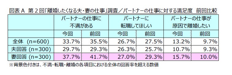 また、3項目すべてで、妻の方が夫よりも回答率が高い状態となっており、「不満がある」における回答率の差異(妻と夫の回答率の差8.0ポイント)が大きいことや、「離婚したい」において妻の回答率が前回から5.7ポイント上昇していることは、妻と夫の意識の差が表れています。(図表A)