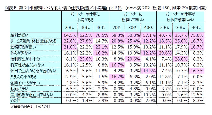 世代別でも、3項目とも全セグメントで「給料が低い」が突出しており、性別や世代に関わらずパートナーの給料の低さは最も不満を持ちやすい要素であることが明らかとなりました。中でも、40代でパートナーの仕事に不満を持つ人や、パートナーの仕事が原因で離婚したい人の4人に3人が、「給料が低い」を不満理由に挙げている点は特徴的であり、40代では「給料の低さ」に対する不満が離婚意識に直結している様子がうかがえます。(図表F)