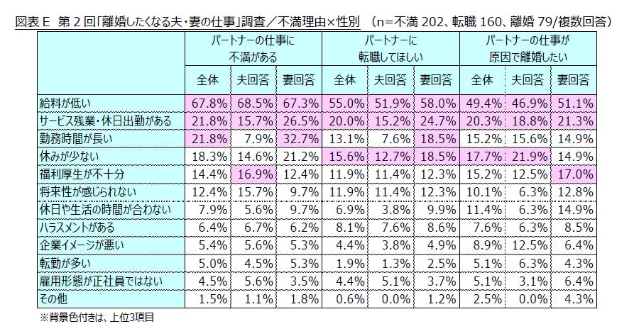 パートナーの仕事に対する不満理由を聞いたところ、「不満の有無」、「転職希望の有無」、「離婚意識の有無」の3項目のすべてにおいて、「給料が低い」が最も高い回答を占める結果となりました。「給料が低い」は、次点の2倍以上の回答率となっており、給料の低さが不満に直結していることが明らかとなりました。(図表E)