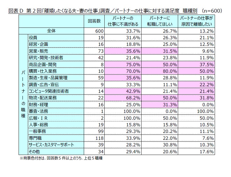今回の調査結果では、全体の3分の1がパートナーの仕事に対して「不満」を持っており、およそ8人に1人がパートナーの仕事を理由に「離婚したい」と考えていることが明らかとなりました。夫よりも妻の方がパートナーの仕事に対して「不満」を持っている傾向が続く中、「離婚したい」と考える妻の割合は前回調査の2022年から5.7ポイント上昇しています。