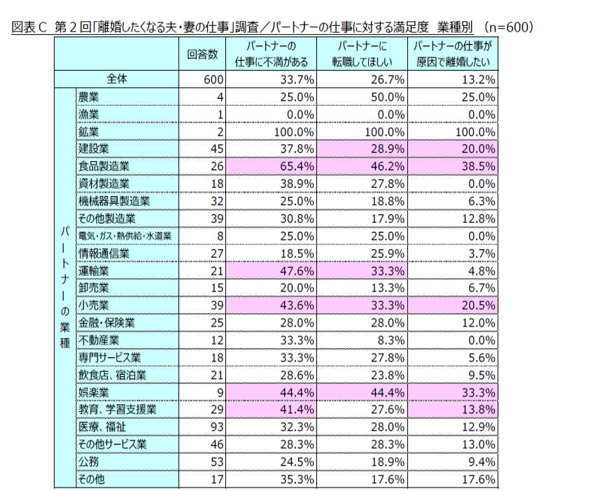 パートナーの仕事の業種別に集計したところ、「不満の有無」、「転職希望の有無」、「離婚意識の有無」のいずれにおいても高い回答率となったのは、「食品製造業」、「小売業」、「娯楽業」(※)となりました。(図表C)