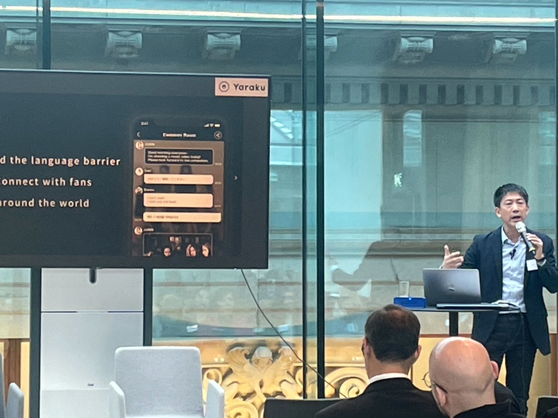 八楽からは海外戦略部長 工藤博樹が登壇し、ヤラクゼンを活用したエンターテイメント分野における翻訳プロジェクトについて発表しました。このプロジェクトは、ワールドツアーを実施中のアーティストのブログや映像コンテンツを、LLM+ポストエディットの手法で3時間以内に7言語に翻訳したものです。