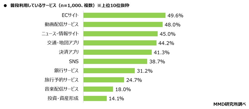 18歳~69歳の男女1,000人を対象に、普段利用しているサービスを聞いたところ(複数回答可)、「ECサイト」が49.6%と最も多く、次いで「動画配信サービス」が48.0%、「ニュース・情報サイト」が45.0%となった。