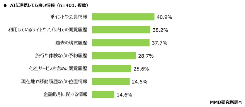 18歳~69歳の男女1,000人のうちAIに連携しても良い情報がある401人を対象に、AIに連携しても良い情報を聞いたところ(複数回答可)、「ポイントや会員情報」が40.9%と最も多く、次いで「利用しているサイトやアプリ内での閲覧履歴」が38.2%、「過去の購買履歴」が37.7%となった。