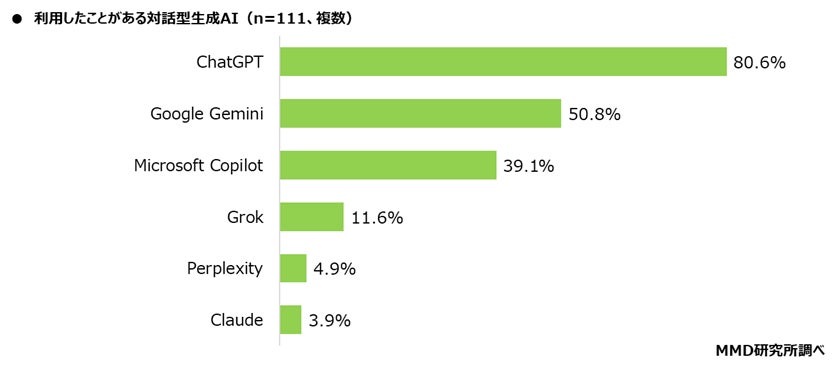 対話型生成AIを利用したことがある111人を対象に、利用したことがある対話型生成AIを聞いたところ(複数回答可)、「ChatGPT」が80.6%と最も多く、次いで「Google Gemini」が50.8%、「Microsoft Copilot」が39.1%となった。