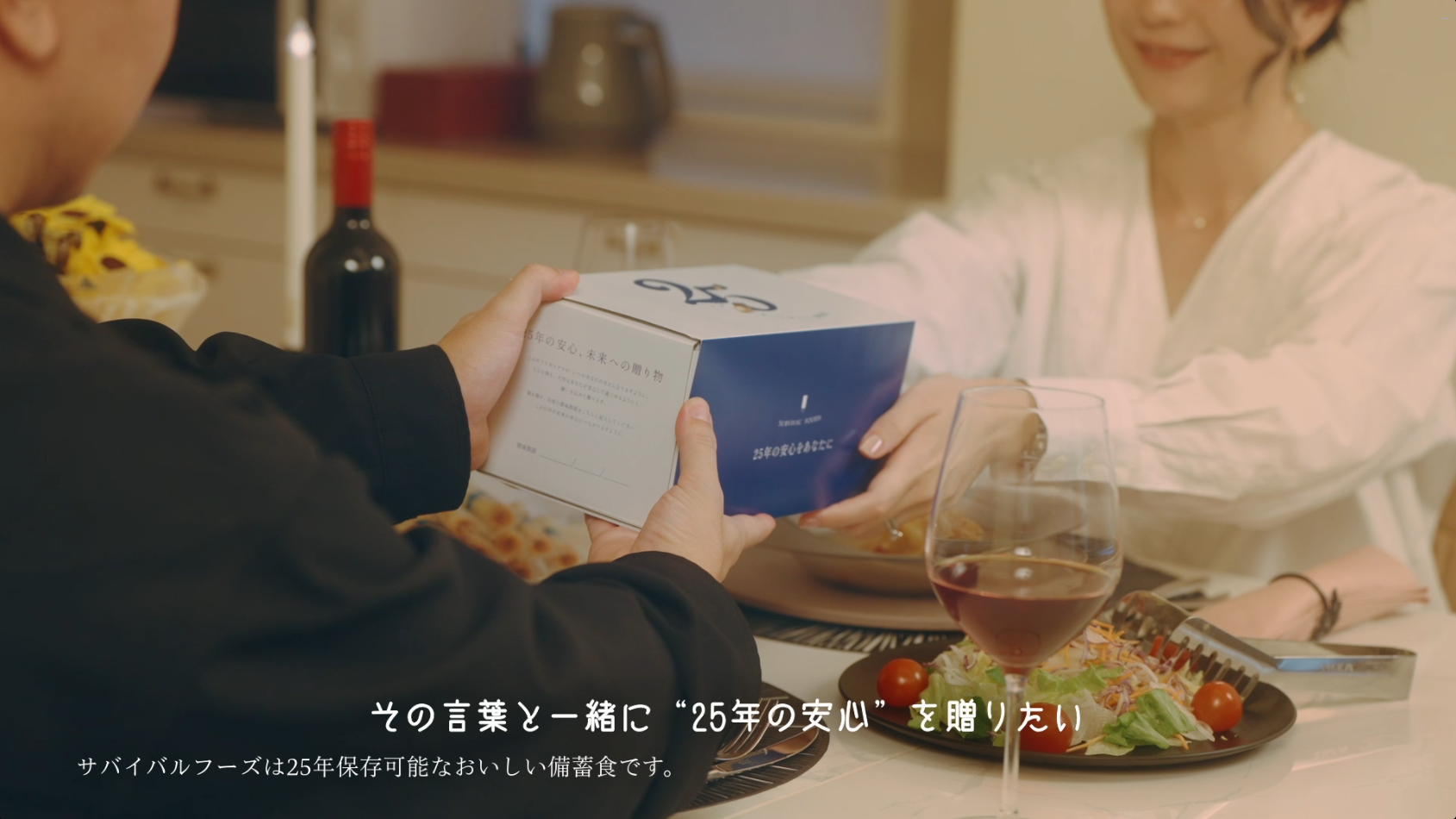 男性が大切な人のための贈り物を選ぶ導入から、「ありがとう」「おめでとう」——そんな日常の節目に寄り添う言葉に続き、“25年の安心を贈りたい”というナレーションが流れ、ギフトとしての「サバイバルフーズ」の新しい可能性を示します。