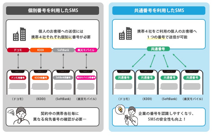 これまで双方向SMSサービスにて提供していた送信者番号の共通化(※2)を、新たに一斉送信を行うお客様にもご利用いただけるように拡張いたします。
