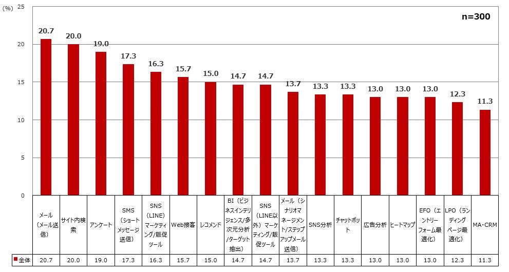 導入に失敗した、使えなくて解約したサービスは「メール送信(20.7%)」「サイト内検索(20.0)」「アンケート(19.0%)」がトップ3ボックスとなりました。トップとなった「メール送信」については、同じメール送信でも「シナリオ/ステップアップメール」の失敗・解約が13.7%となっており、逆説的に言うと手間暇や創意工夫を凝らした「メール送信」には、ある効果があり、「失敗・解約のスコアが低くなった」との推測もできます。