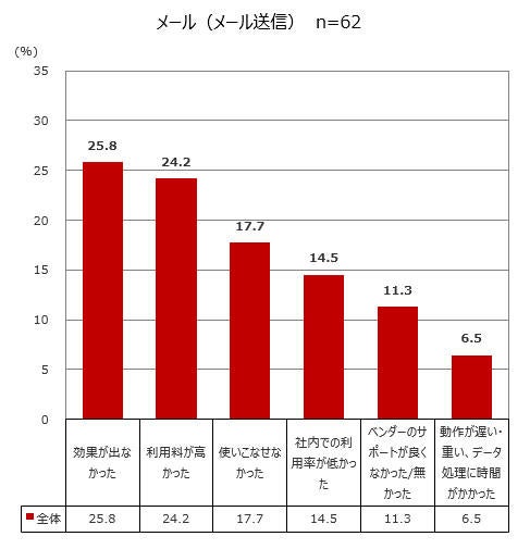 導入に失敗した、使えなくて解約したEC関連サービストップの「メール送信」の理由としては、「効果が出なかった(25.8%)」「利用料が高かった(24.2%)」が2トップボックス。効果が出ない上に、利用料が高いといったことで、サイト内検索とは0.7%違いの僅差ではありますが、導入に失敗・解約したEC関連サービスのトップとなりました。