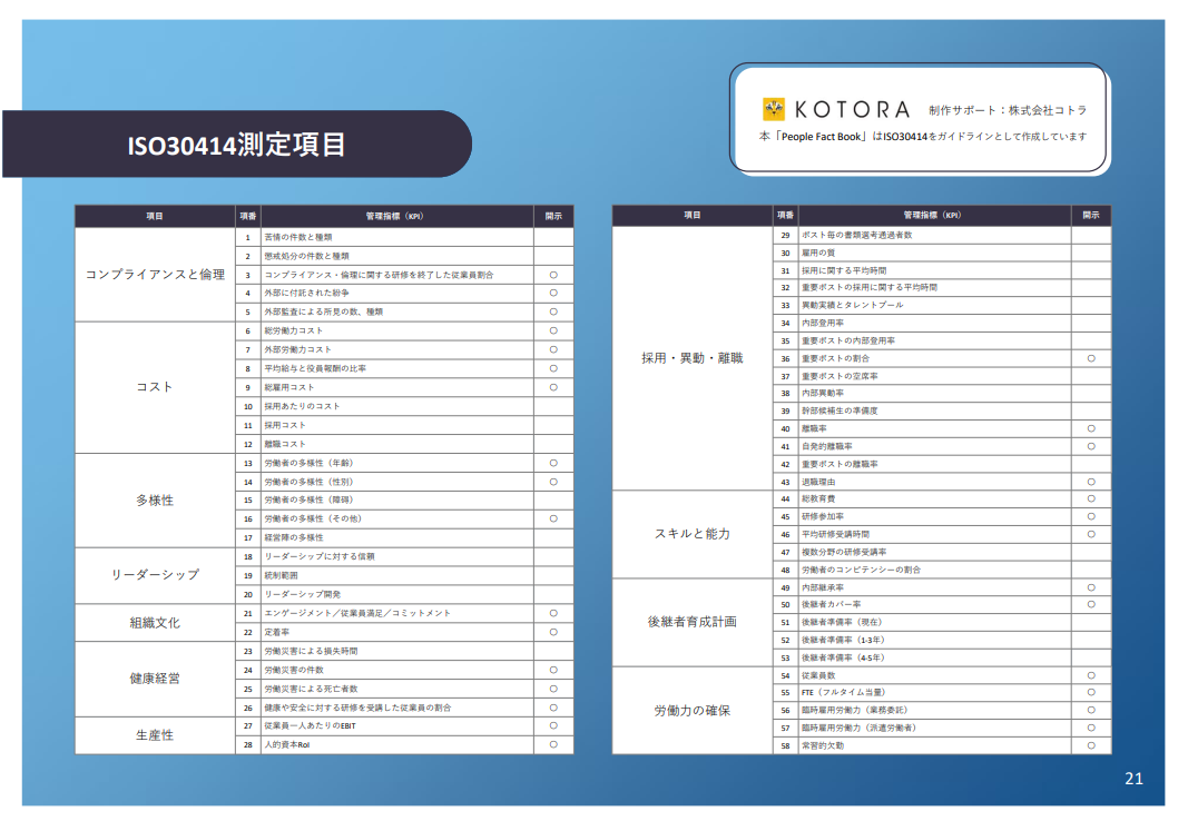 また、本レポートは、建設業として初の「ISO30414」準拠の人的資本レポートであるとともに、コトラの人的資本コンサルティングとして2社目のISO30414準拠のHRレポートの開示支援導入事例となります。