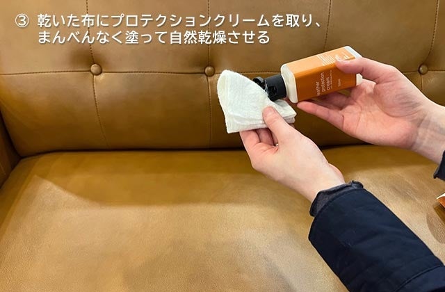 ③革がしっかり乾いたら、乾いた布にプロテクションクリームを取り、革表面にまんべんなく塗っていきます。