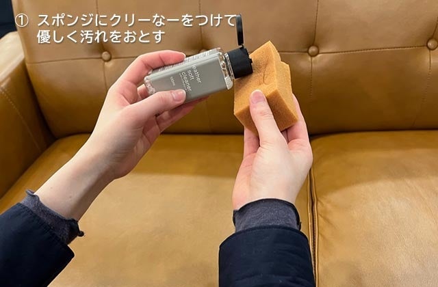①まずスポンジにクリーナーを付けてよく揉みます。この時クリーナーをしっかり泡立てるのがポイントです。よく泡立てたらスポンジでくるくると円を描くように汚れを落とします。力は入れず、洗顔するときの力加減をイメージして優しく洗いましょう。