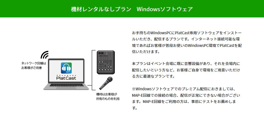 Windows版は従来のような機材貸し出しタイプとは異なり、お手持ちのWindowsパソコンに本ソフトウェアをインストールしていただき、サービスをご利用いただく配信プランです。いつも利用しているネットワーク環境や、使い慣れたマイク・ヘッドセット、パソコンを利用して配信することができます。