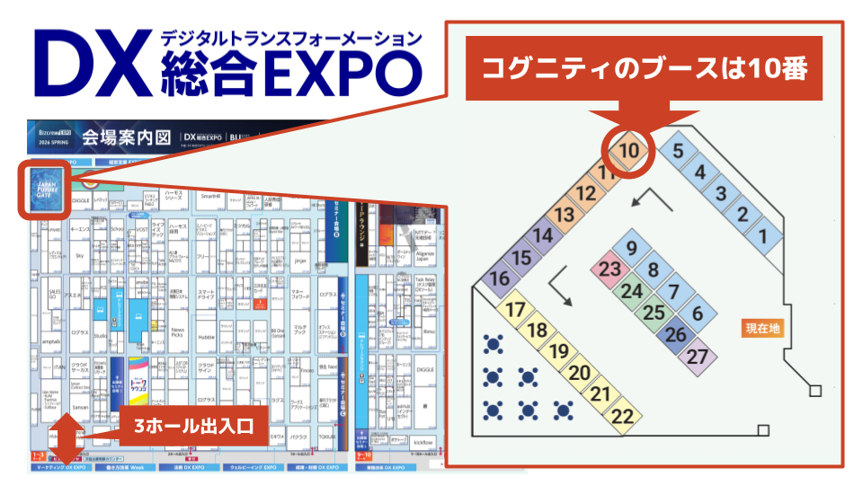 会期は2026年2月25日(水)〜27日(金)、会場は幕張メッセの3ホールです。コグニティはDX総合EXPO内の特設展示エリア「Japan Future Gate」に出展し、ブースにて各サービスの事例紹介および個別相談を実施します。