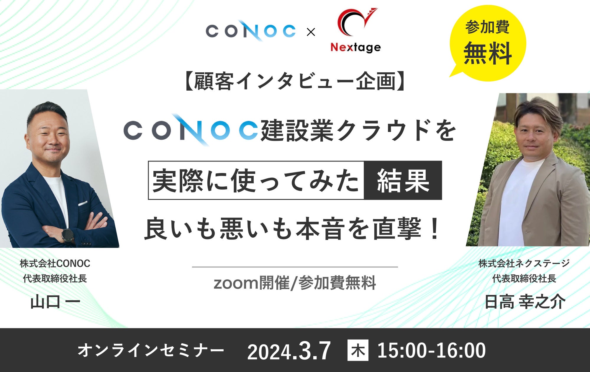 そこで、業務管理ツール導入に悩んでいる企業様の不安や疑問を解決するため、本セミナーを開催することにいたしました。実際に、CONOCの業務管理ツールを導入しているネクステージ様に使用感の良い点・悪い点など、本音を直撃するセミナーとなっておりますので、この機会に是非ご参加ください。