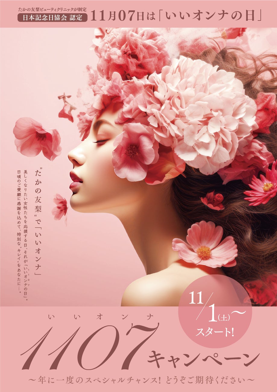 株式会社不二ビューティが展開するエステティックサロン「たかの友梨ビューティクリニック」(電話:0120-00-1107、インターネット:http://www.takanoyuri.com/)は、11月1日(土)より「いいオンナの日」を記念した1107キャンペーンを開始いたします。「いいオンナの日」とは、美しくなりたい女性を応援するために“たかの友梨”が制定した特別な日です。創業当時より「1107」を「いい(11)オン(0)ナ(7)」と読み、サロンの電話番号などに使用してきたことから、11月07日を「いいオンナの日」と定めました。日本記念日協会からも認定を受けています。