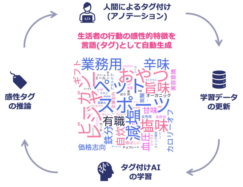 具体的には、1.あらかじめ定めたルールベースで感性タグを付与、2.感性タグを付与されたユーザーの購買行動データをAIが学習して他のユーザーの感性タグを推論、3.推論結果を人間が修正、4.修正した結果に基づいて、AIの再学習を行う、という手順で感性タグを付与していきます。この過程には、購入ユーザーの感性的特徴を用いて付与される商品感性タグの付与、更新手順も含まれています。