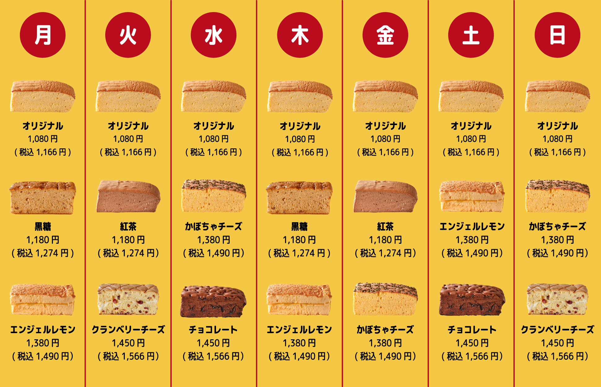 名東では曜日ごとに日替わりで数種のフレーバーのカステラを販売しております。