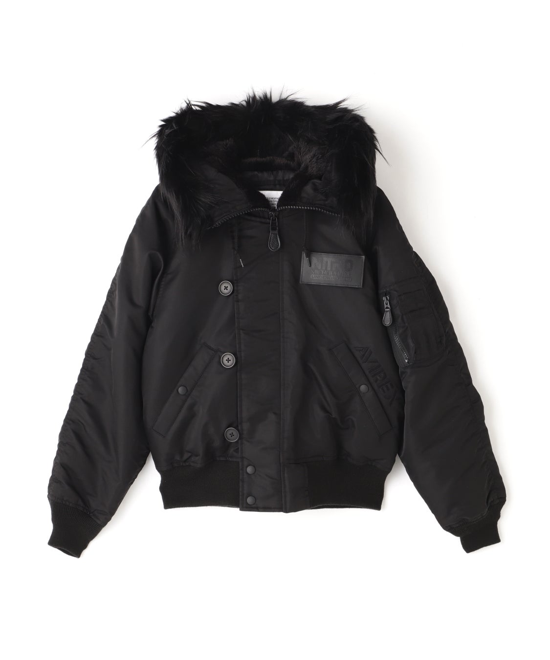 第三弾コラボレーションは本物のフライトジャケットを作り続けてきたAVIREXが、コマーシャル(民間向け)用に生産し、現代にマッチするシルエットにアップデートした「N-2B」をベースに「NMU」のシグネチャーロゴを同色で背中に刺繍。フロントには「NMU」ロゴ入りパッチをオン。フードのファーもボディと色を合わせ、NMUコラボらしい黒を基調としたデザインとなっている。